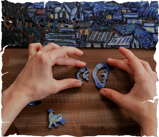 The puzzle has a voluminous finishing — it imitates Van Gogh’s expressive strokes and his personal painting technique. The whimsy pieces present the story of his difficult life and incredible creativity.