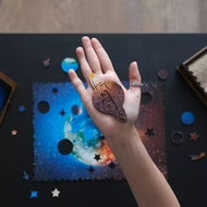 Twinkling stars shine their light around them. The long tails of comets leave bright trails behind them. The puzzle pieces are surprisingly shaped like planets and solar vortices. The sun’s bright rays illuminate a real space adventure.
